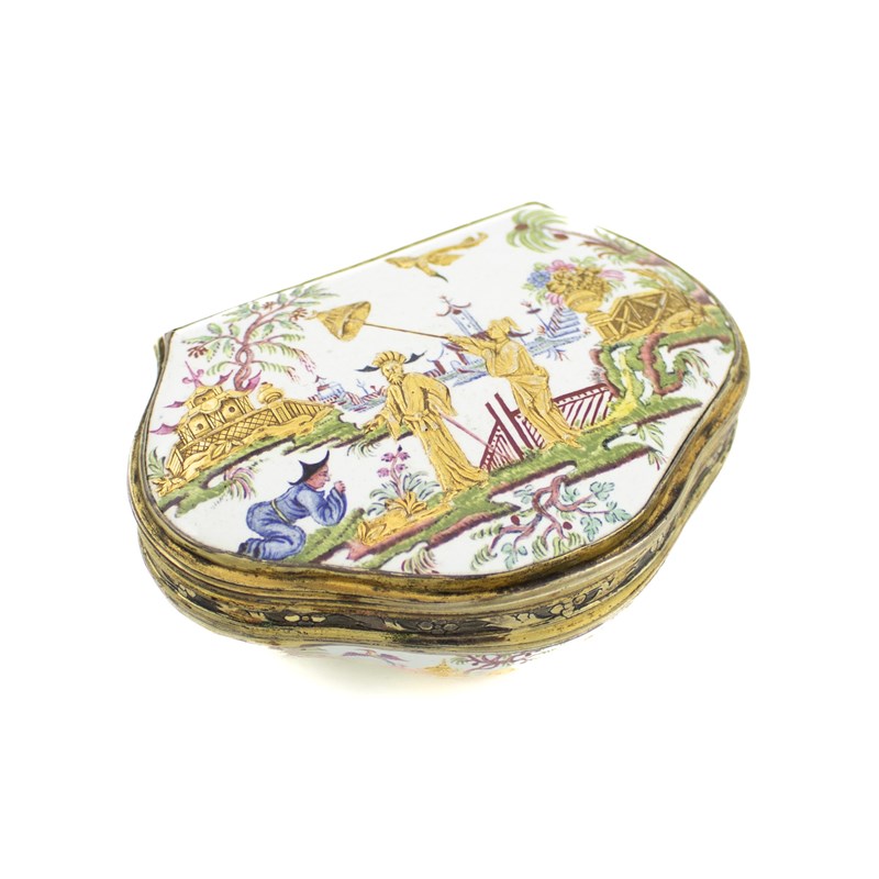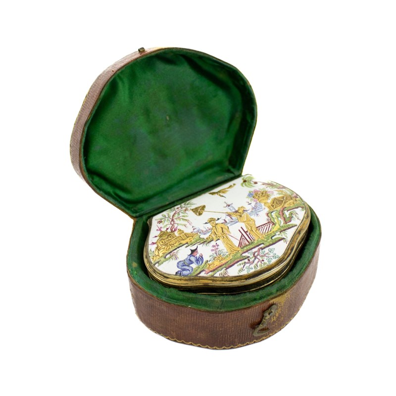 cartouche form, decorated with gilded Chinese figures in landscape settings with pagodas, the base with a spray of flowers, the interior decorated with flowers, and with a seated Chinese figure, in a later case, length 8.2cm.