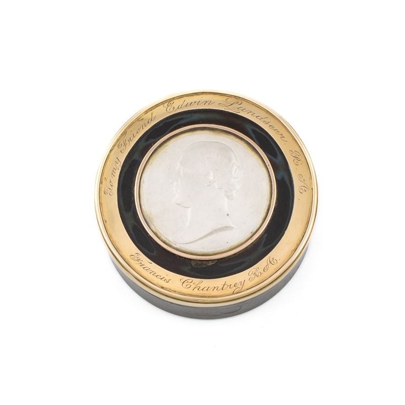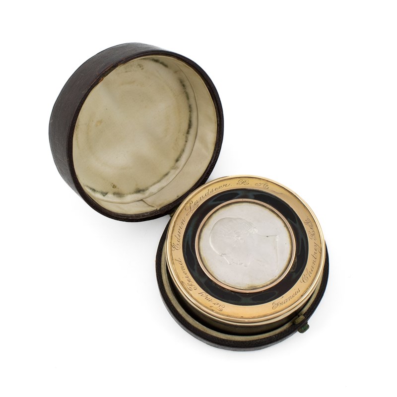 circular form, the pull-off cover has a plain gold mount inscribed ' To My Friend Edwin Landseer R. A. Francais Chantrey R. A.', with a central relief of Francis Chantrey, the interior of the cover with some scratch writing, in a fitted case, diameter 8.4cm.