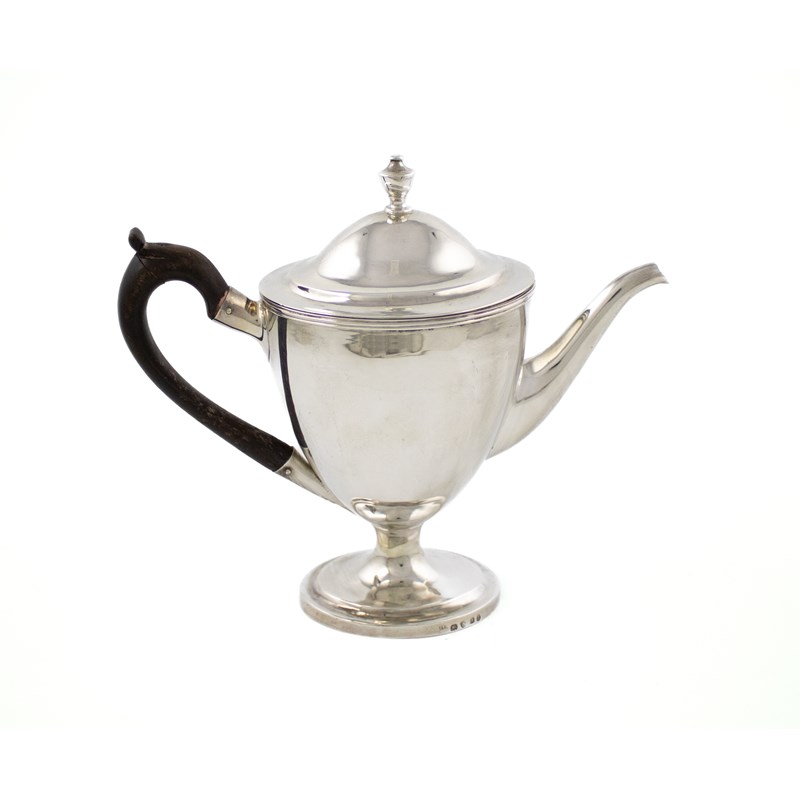 plain vase form, scroll handle, a domed pull-off cover with knop finial, the interior with a tapering heating compartment with a pull-off cover, on a raised circular foot, height 17.2cm, approx. weight 9.1oz.
