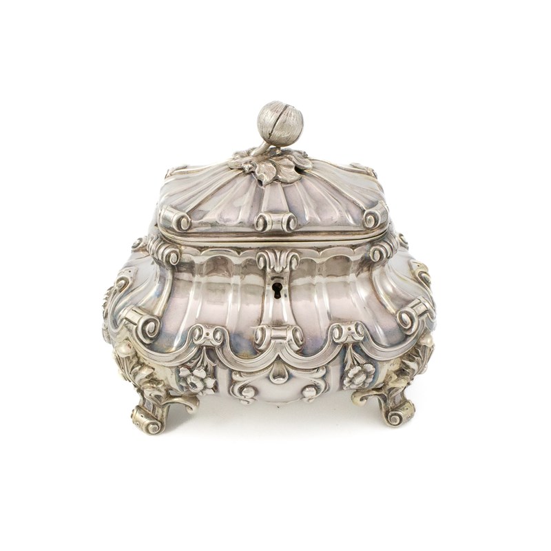 rounded rectangular bombé form, embossed foliate scroll decoration, fluted hinged cover with a pumpkin finial, on four scroll bracket feet, length 15cm, approx weight 19.5oz.