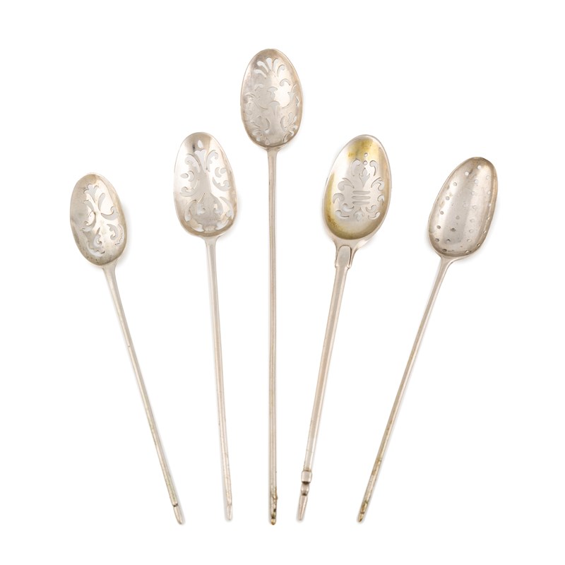 including one with shoulders, with a pierced scroll bowl, with traces of gilding, scratch initailled 'E.B', plus two with maker's marks and pierced scroll bowls, and two others with plain rat-tails and pierced decoration, approx. total weight 1.1oz. (5)