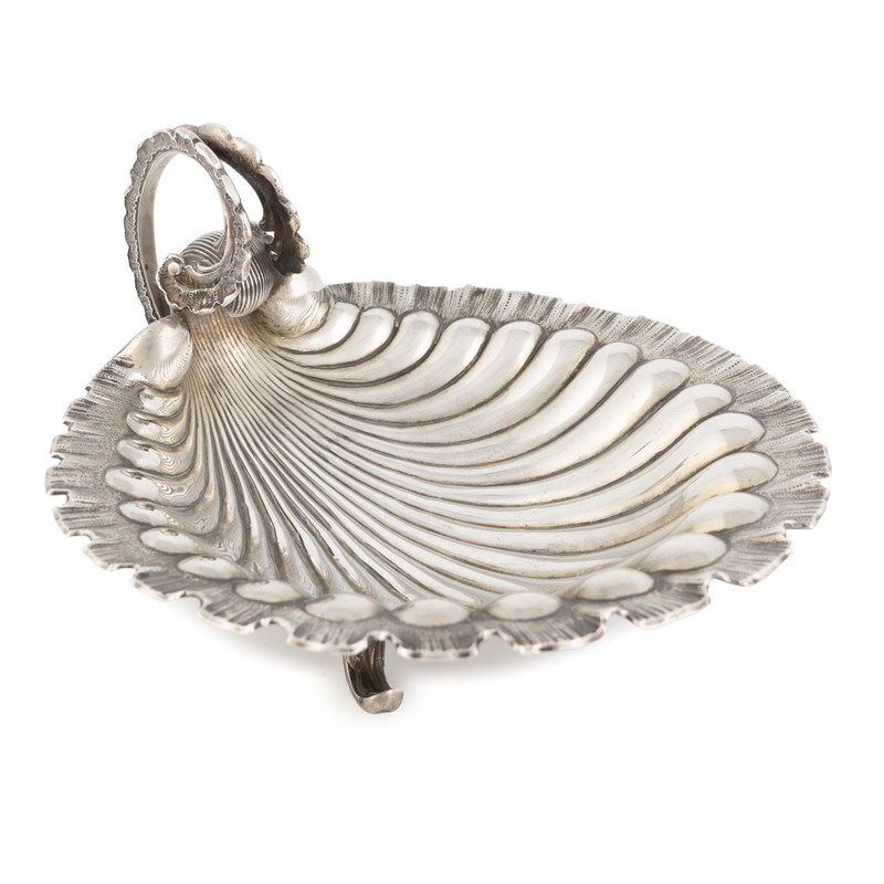scallop shell form with a shell scroll handle, on four pad feet, diameter 20.6cm, approx. weight 15.1oz.