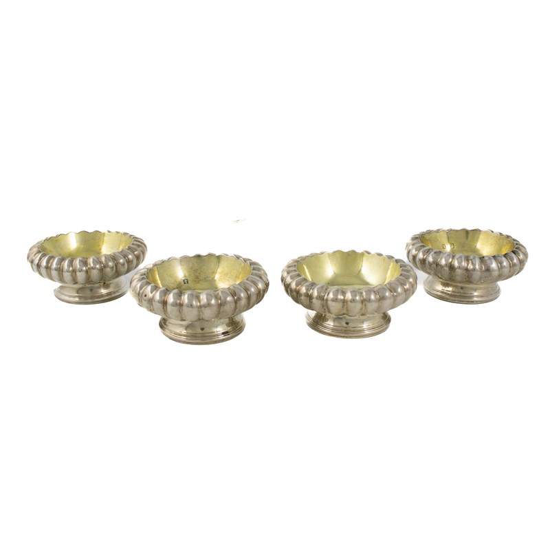 circular form, fluted decoration, gilded bowls, diameter 8.7cm, approx. weight 13.5oz. (4)