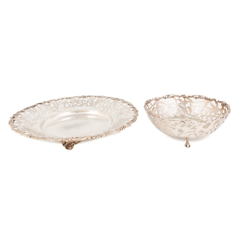 circular form, pierced and engraved foliate decoration, pierced foliate scroll borders, approx. total weight 27oz. (2)