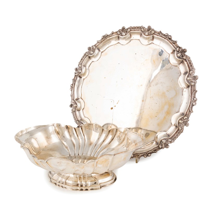 circular form, foliate and scroll border, diameter 35.5cm, plus an Italian silver bowl, of lobed oval form, on a lobed oval foot, length 30cm, approx. weight 46oz. (2)