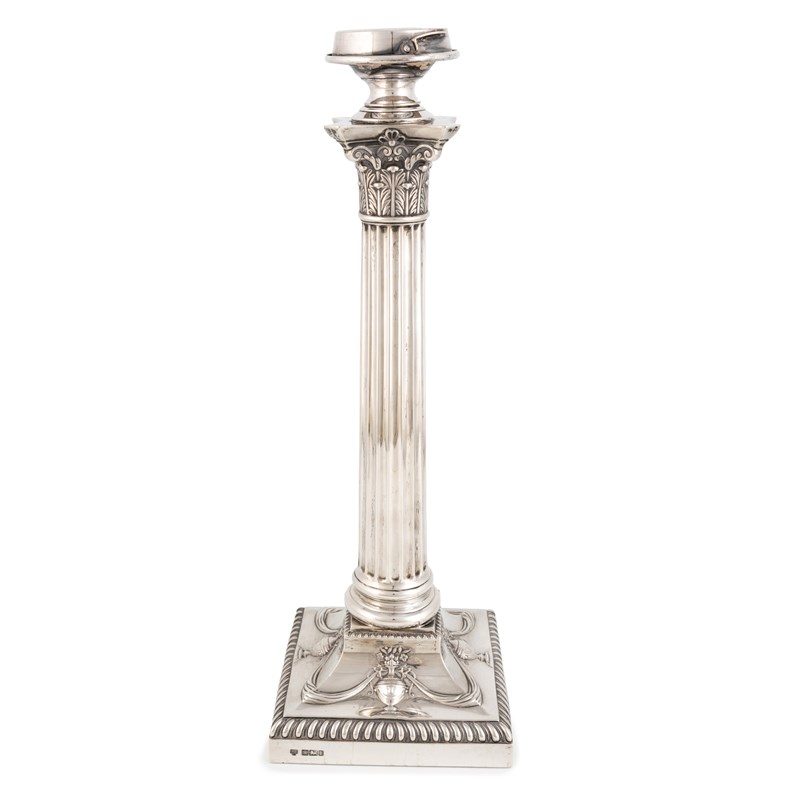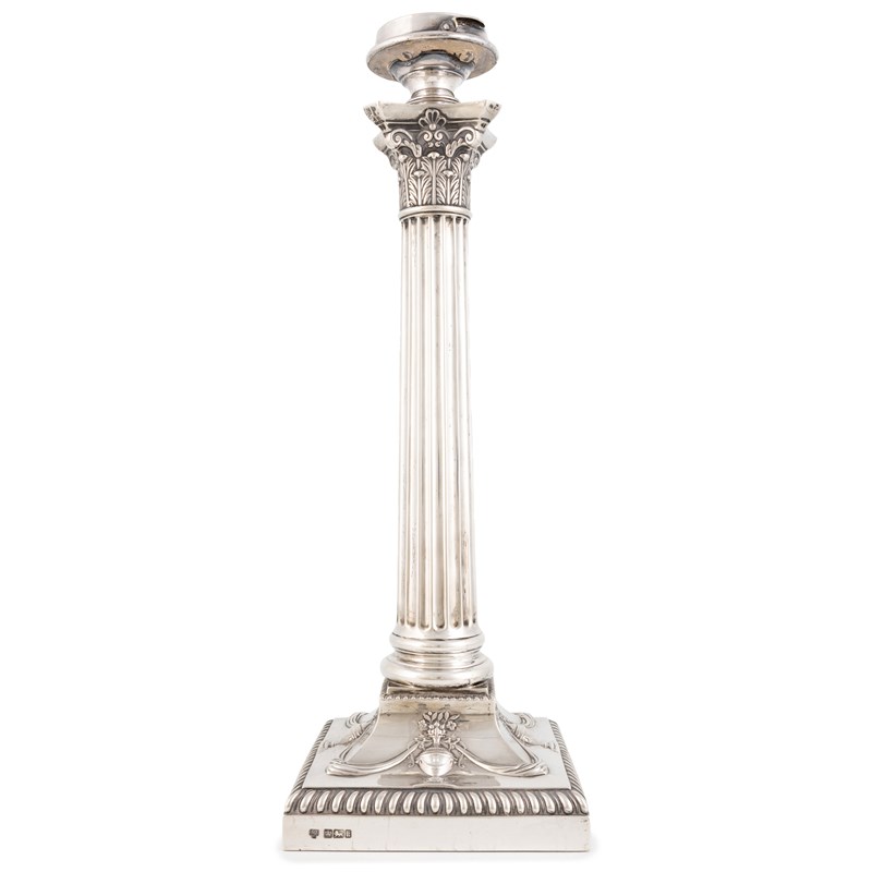 fluted column, on a raised square base with urn motifs, lacking oil reservoir, height 40.2cm