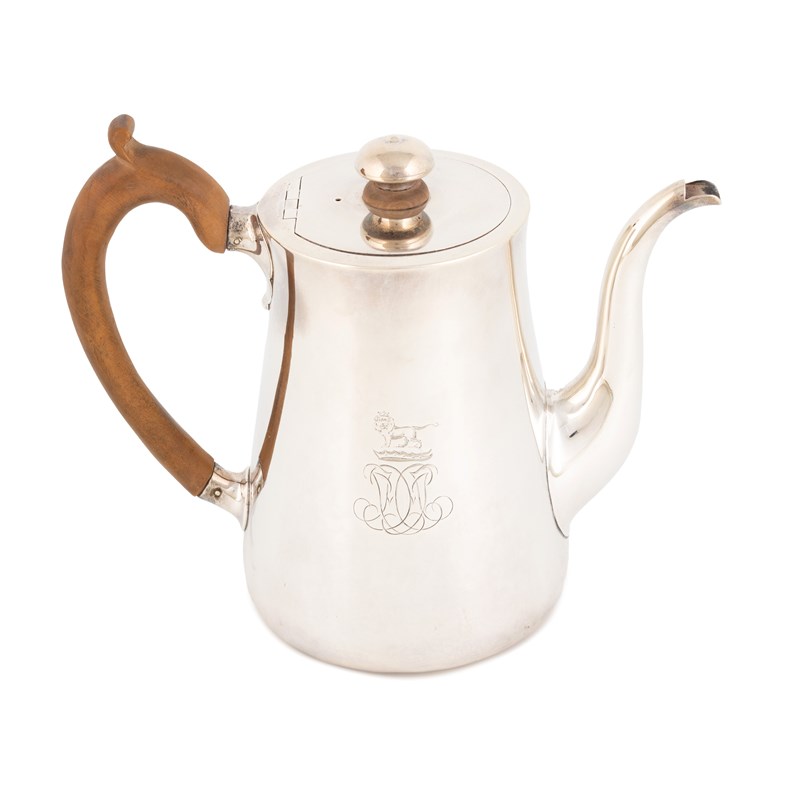 tapering circular form, wooden scroll handle, flush-hinged cover with a knop finial, engraved with a crest and monogram, height 19cm, approx. weight 18oz.