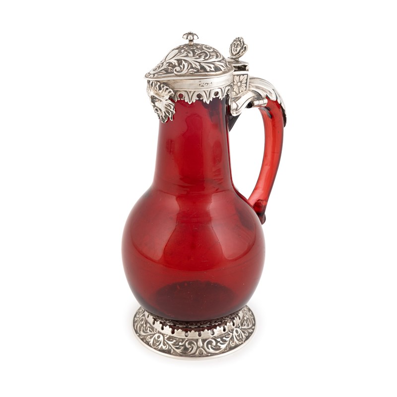red glass baluster body, with scroll foliate decorated mounts, hinged cover with a fluted knop finial, on a circular foot, height 17.3cm.