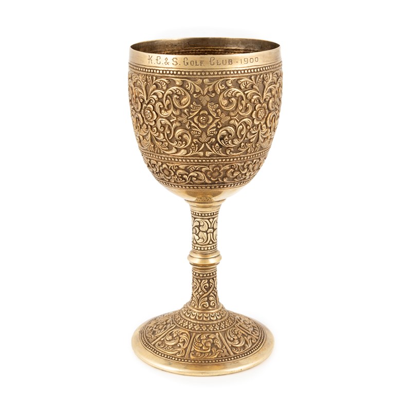 urn-shaped bowl, chased scroll foliate decoration on a matted background, knopped stem on raised circular foot, inscribed 'K.C & S Golf Club 1900', height 16.6cm, approx. weight 9oz.