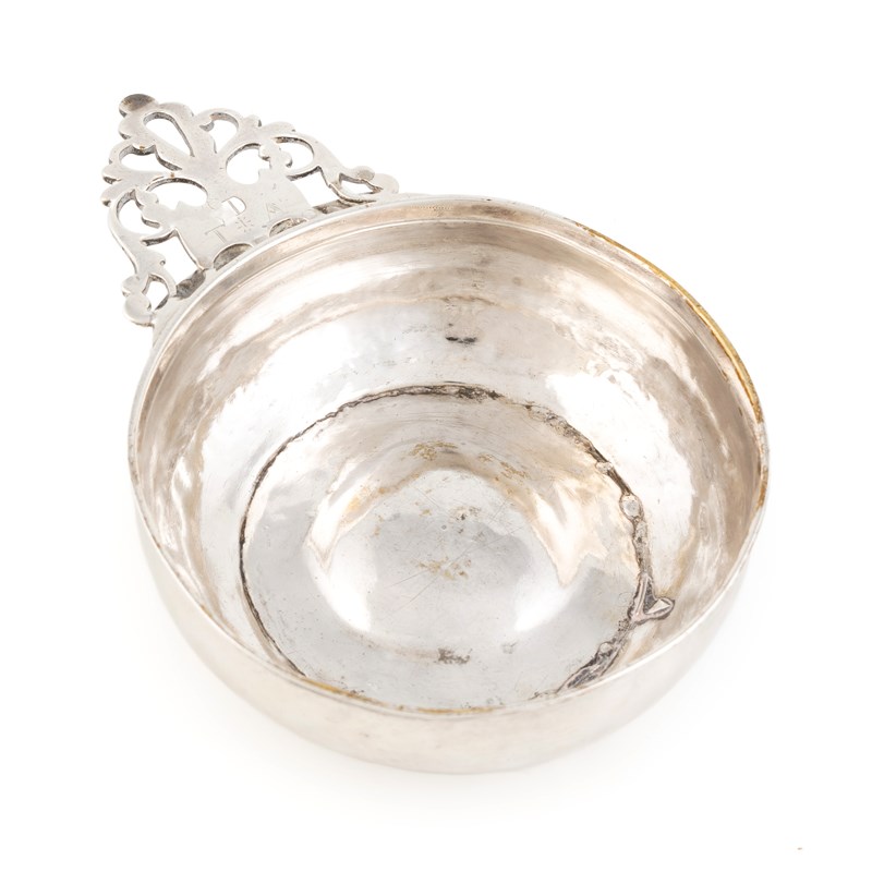 circular bowl, the handle with pierced decoration, scratch initialled 'D' over 'T*A', repaired, length 19.2cm, approx. weight 6.8oz.