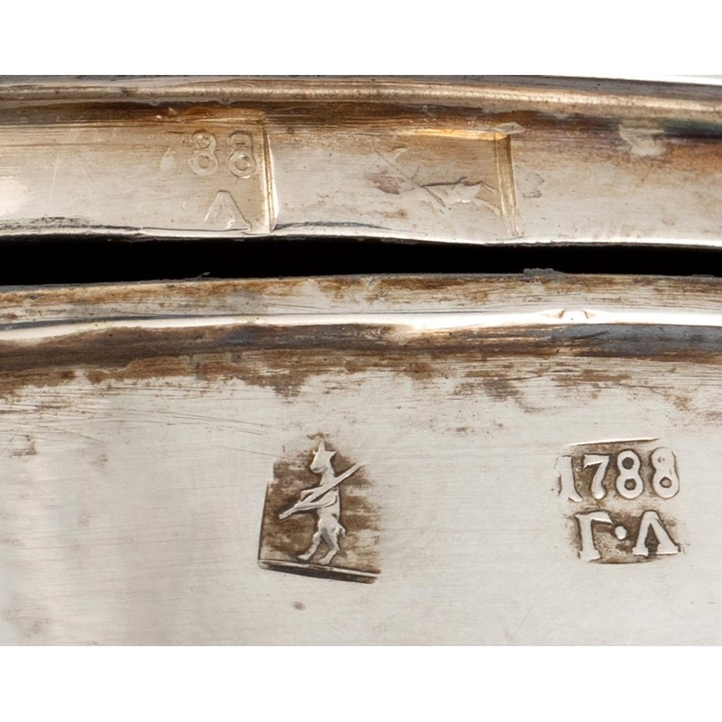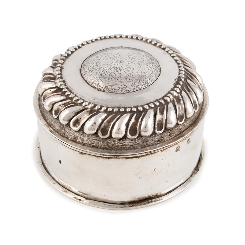 circular form, the pull-off cover with luted and beaded decoration, the centre with a foliate motif, diameter 11.7cm, approx. weight 8oz.
