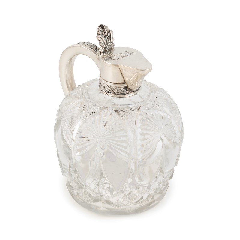 cut glass bulbous body, scroll handle with a leaf border, engraved initials to the hinged cover, height 14.5cm.