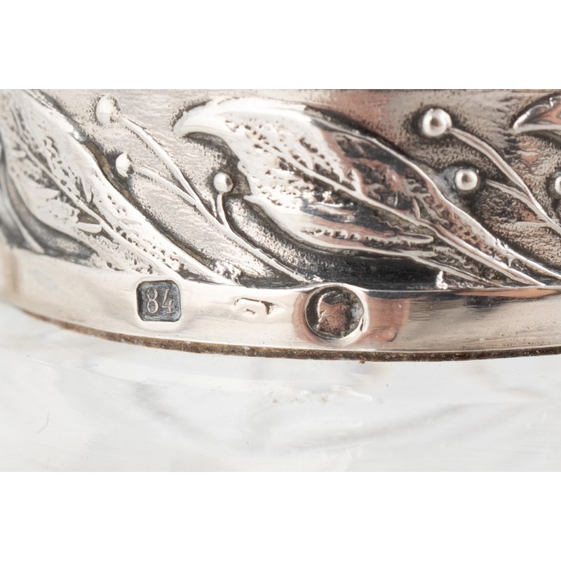 A late-19th/early-20th century Russian silver-mounted glass liqueur decanter,