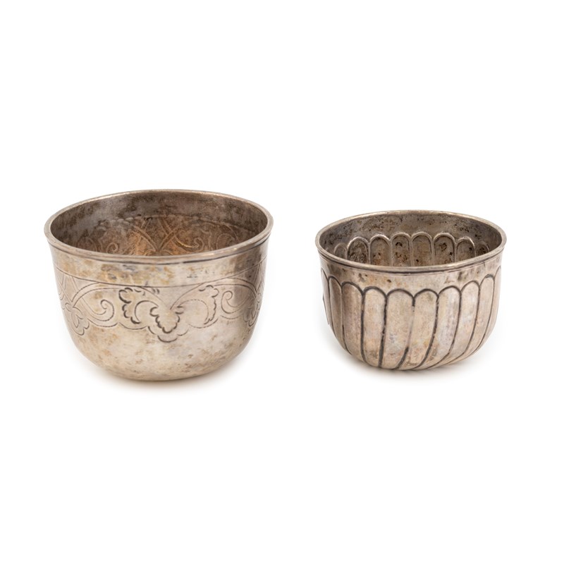 circular form, part-fluted decoration, plus another 18th century Russian silver vodka cup, maker's mark AS, circular form, chased foliate decoration, approx. weight 2oz. (2)