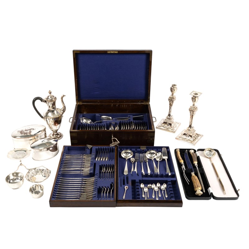 comprising: silver items: a bowl, London 1963, a bonbon dish modelled as a tripod table, another bowl and a punch ladle with a twisted whalebone handle, plus old Sheffield plated and electroplated items: a Hanoverian pattern canteen for twelve, in a fitted wooden case, a pair of candlesticks, (one sconce missing), a coffee pot, two biscuit boxes, a three-piece carving set and a pierced dish, approx. weighable 8.4oz. (qty)