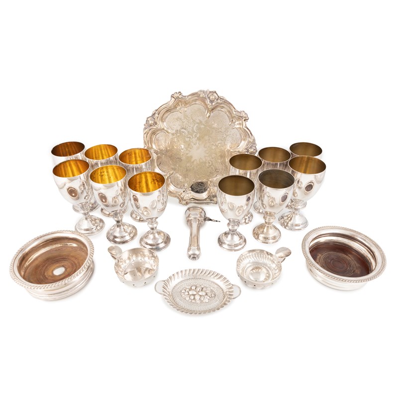 comprising: two French silver wine tasters, a two-handled dish, plus an electroplated hambone holder, two wine coasters, a salver and twelve goblets, total approx. weighable 10.7oz. (qty)