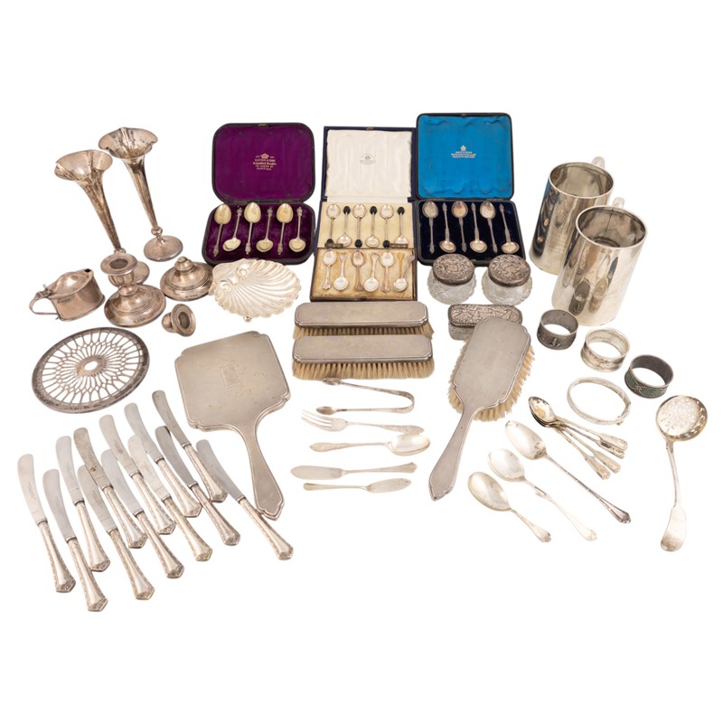 comprising: a pair of Edwardian silver tankards by Thomas Bradbury & Sons, London circa 1900, four cased sets of teaspoons, twelve butter knives, three napkin rings, a mustard pot, a sugar sifter, a pair of sugar tongs, a bangle, a butter dish, a pair of dwarf candlesticks, a pair of tulip vases, a silver-mounted glass coaster, two brushes, a hair brush, a hand mirror, two silver mounted glass jars and various other flatware, total approx. weighable 22.8oz. (qty)
