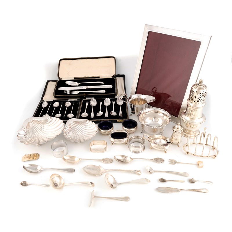 comprising: a photograph frame of rectangular form, engine-turned decoration, Birmingham 1927, a sugar caster, two shell butter dishes, a toast rack, a cream jug and sugar bowl, a three-piece condiment set, a pair of salt cellars, three napkin rings, a Maltese wine label, a cased knife, fork and spoon set, two sets of six spoons and other items of flatware, approx. weighable 30oz. (qty)