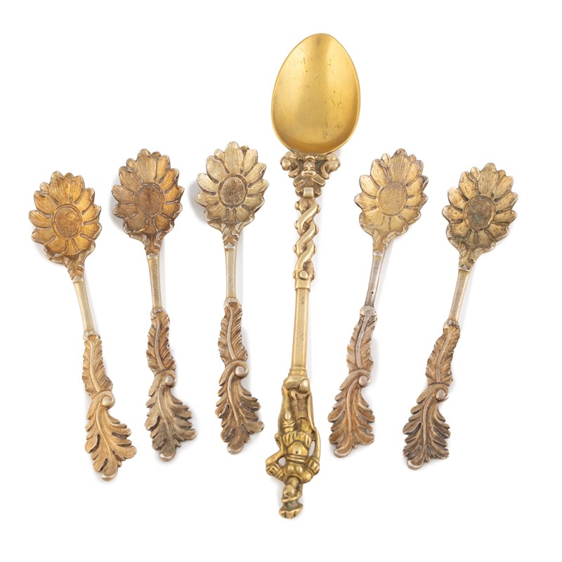 flower head and shell bowls, foliate handles, plus a Victorian silver-gilt spoon, by Henry Holland, London 1871, with a warrior finial, approx. total weight 3.6oz. (6)