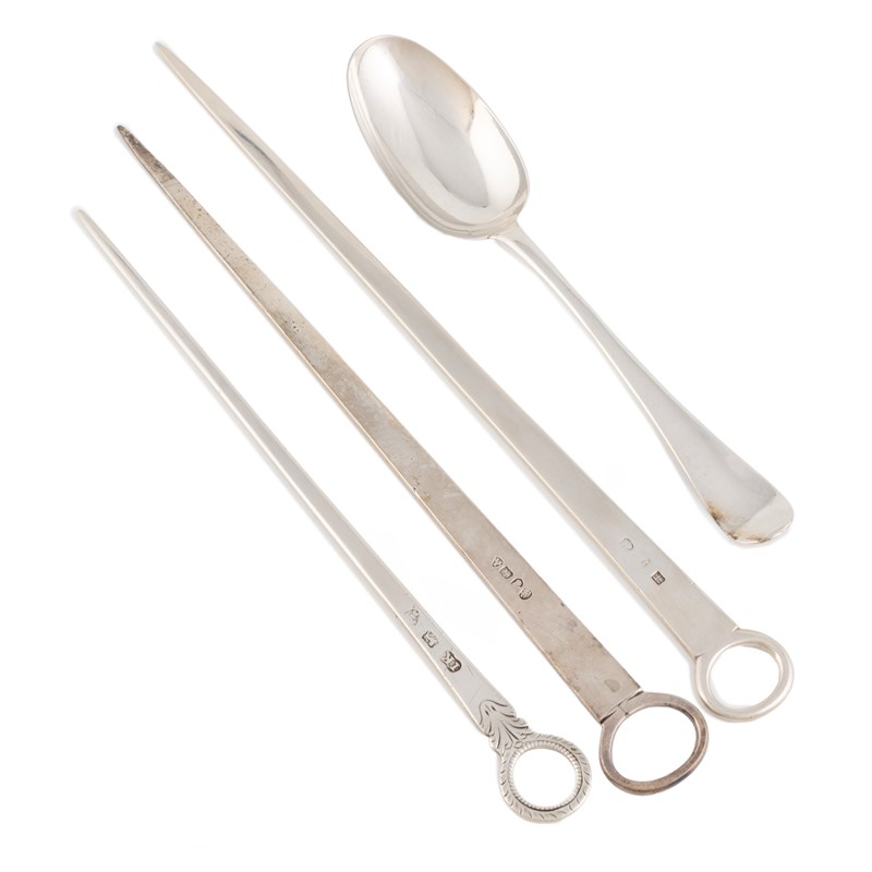 A collection of three George III Newcastle silver meat skewers,