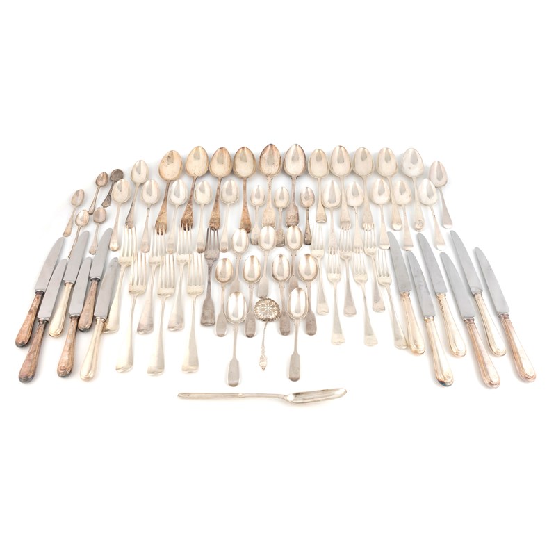 comprising: a set of six table forks, by George Adams, London 1866, a set of six dessert spoons, London 1830, a set of six Feather-edge dessert spoons and four tablespoons, London 1771, a pair of Peter and Ann Bateman tablespoons, five other tablespoons, a table fork, a Thread pattern marrow scoop, London 1787, a set of six teaspoons, six other teaspoons, a sugar sifting spoon, six table knives and six dessert knives, three teaspoons and two plated teaspoons, approx. weighable 74oz. (qty)