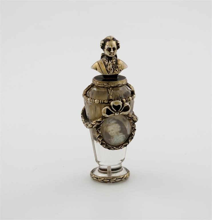 tapering form, faceted glass body, the ribbon-tied mounts with two portraits and mounted with a bust finial, length 8.5cm.