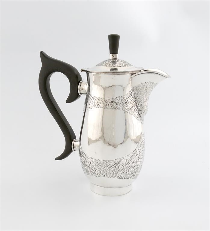 slender baluster form, textured decoration, scroll handle, the hinged cover with an elongated tapering finial, on a circular foot, height 23cm, approx. weight 22oz.
