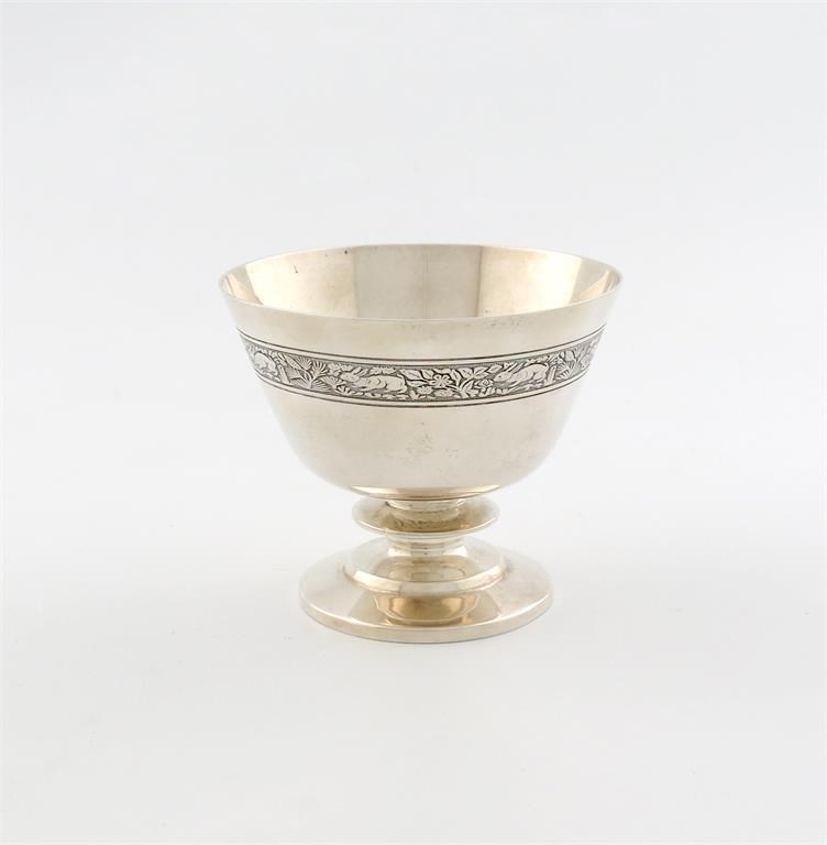 tapering circular form, with a chased girdle of animals and foliate decoration, on a raised circular foot and knopped stem, height 9.8cm, approx. weight 7.8cm.