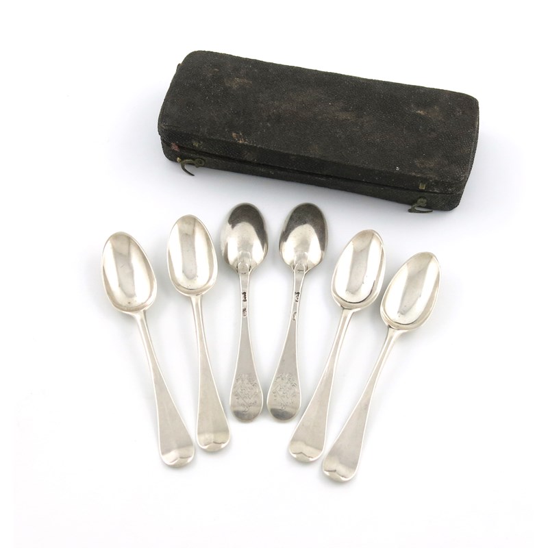 the reverse of the terminals with an armorial within a widow's lozenge with foliate mantling, in an associated shagreen case, approx. weight 3.6oz. (6)