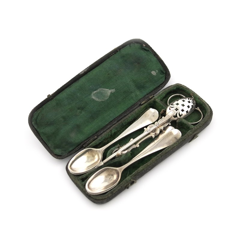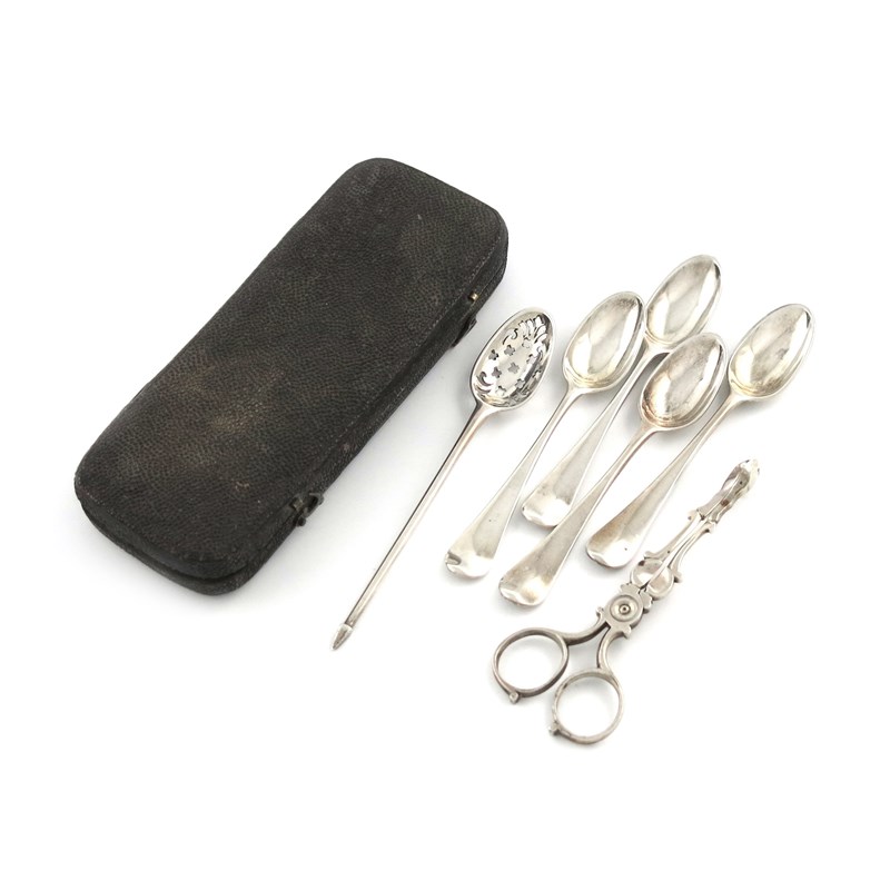 the mote spoon possibly by Ebenezer Coker, the nips and spoons unmarked, circa 1750-60