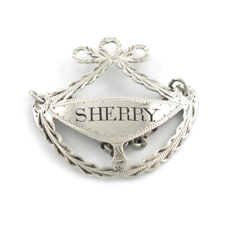 goblet form, with pierced ribbon-tied festooned borders, bright-cut decoration, incised 'SHERRY', length 4.6cm, approx. weight 0.2oz.