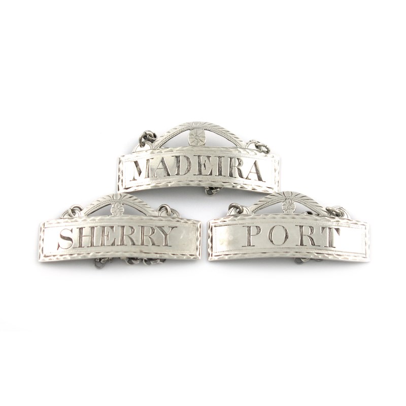 rectangular form, bright-cut border, pierced pediment, incised 'MADEIRA', 'SHERRY' and 'PORT', length 4.8cm, approx. weight 0.6oz. (3)