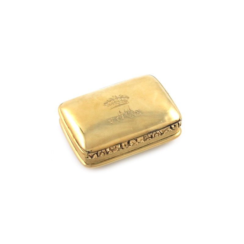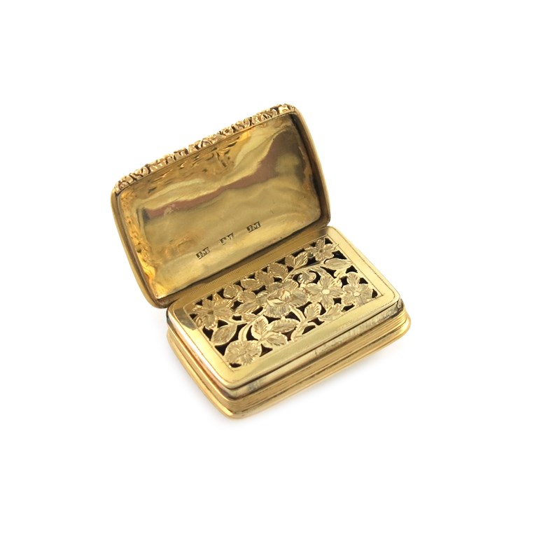 rounded rectangular form, with a foliate thumb piece, the hinged cover engraved with a coronet above initials MA, the interior with a foliate pierced hinged grille, length 4.4cm, approx. weight 30.6g.