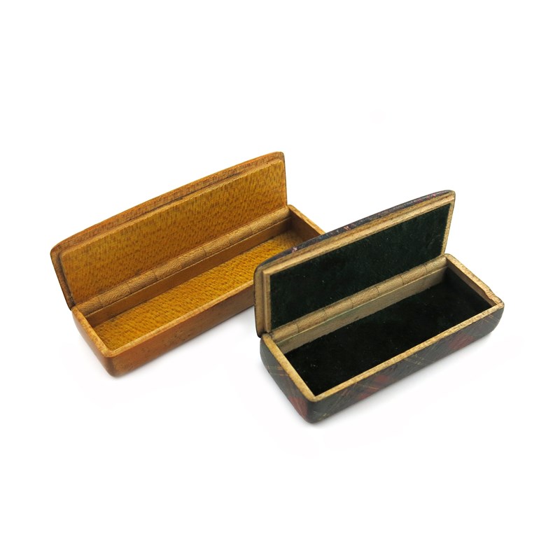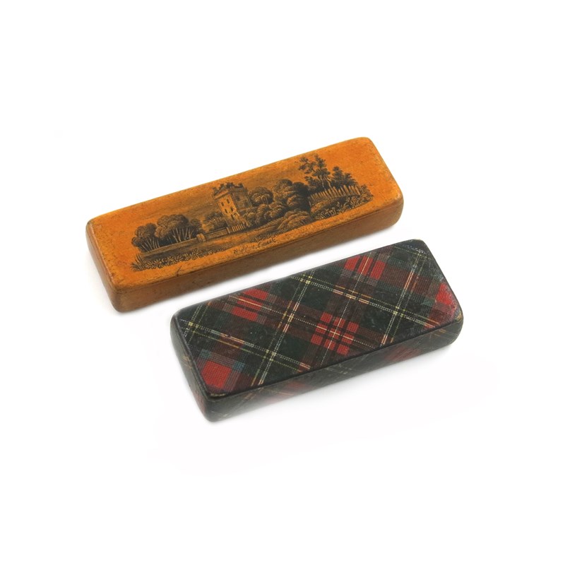 rectangular form, the hinged cover with a view of Niddrie Castle, West Lothian, length 7.8cm, plus a 19th century Tartanware toothpick box, length 6.7cm. (2)