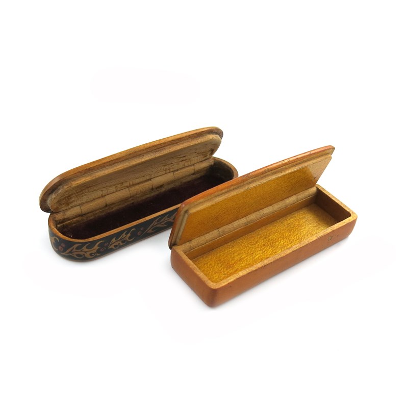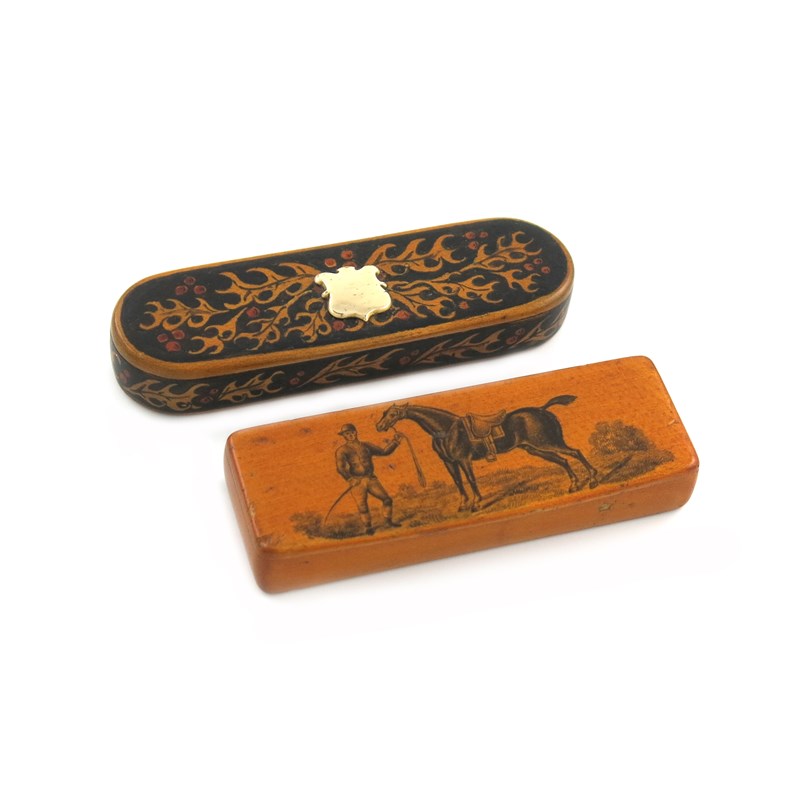 rectangular form, the hinged cover with a scene of a jockey and horse, length 7.4cm, plus a 19th century Mauchline ware toothpick box, rectangular form, decorated with holly and berries, and with an unmarked gold cartouche, length 8cm. (2)