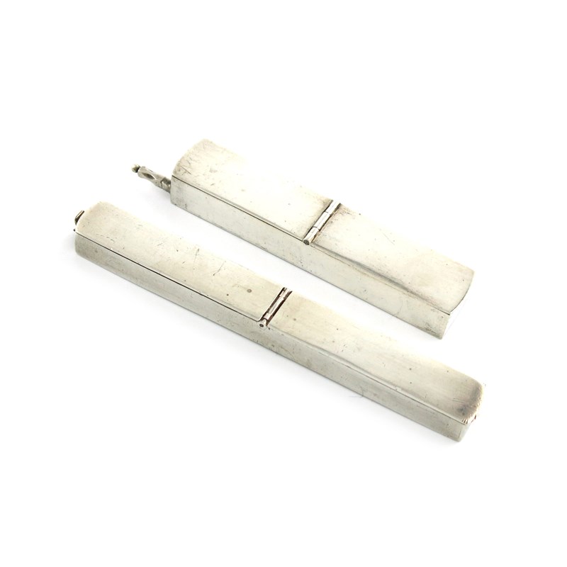 rectangular form, with two compartments and plain hinged covers, plus an early 19th century French silver dental powder box of rectangular form, lengths 9.4cm and 7.8cm, approx. weight 1.5oz. (2)