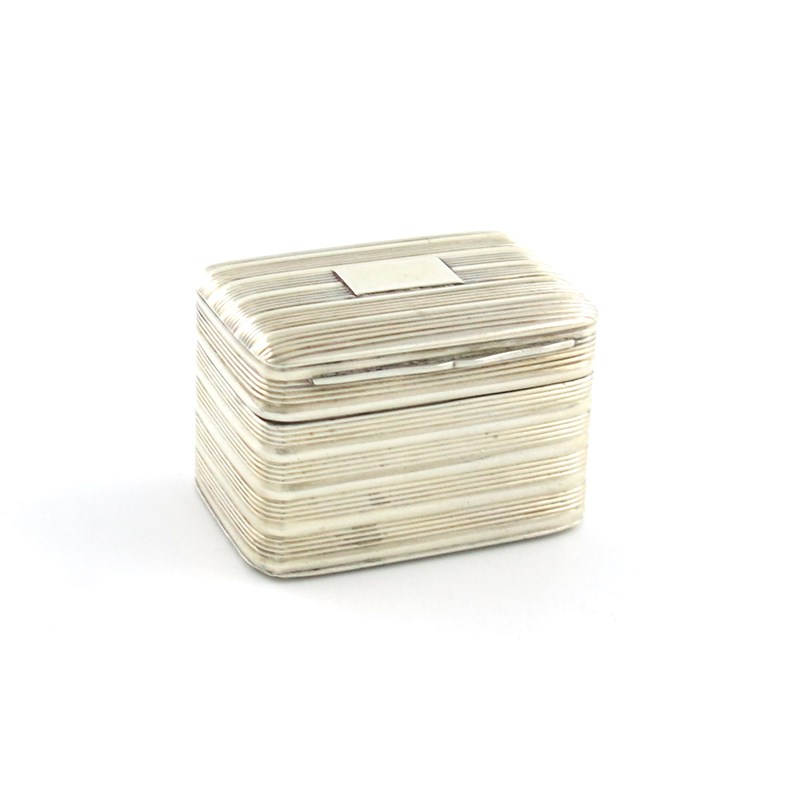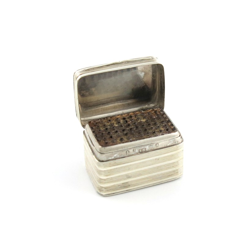rectangular form, reeded decoration, the hinged cover opens to reveal a hinged grater, the cover with a vacant cartouche, length 3.8cm, approx. weight 1.3oz.
