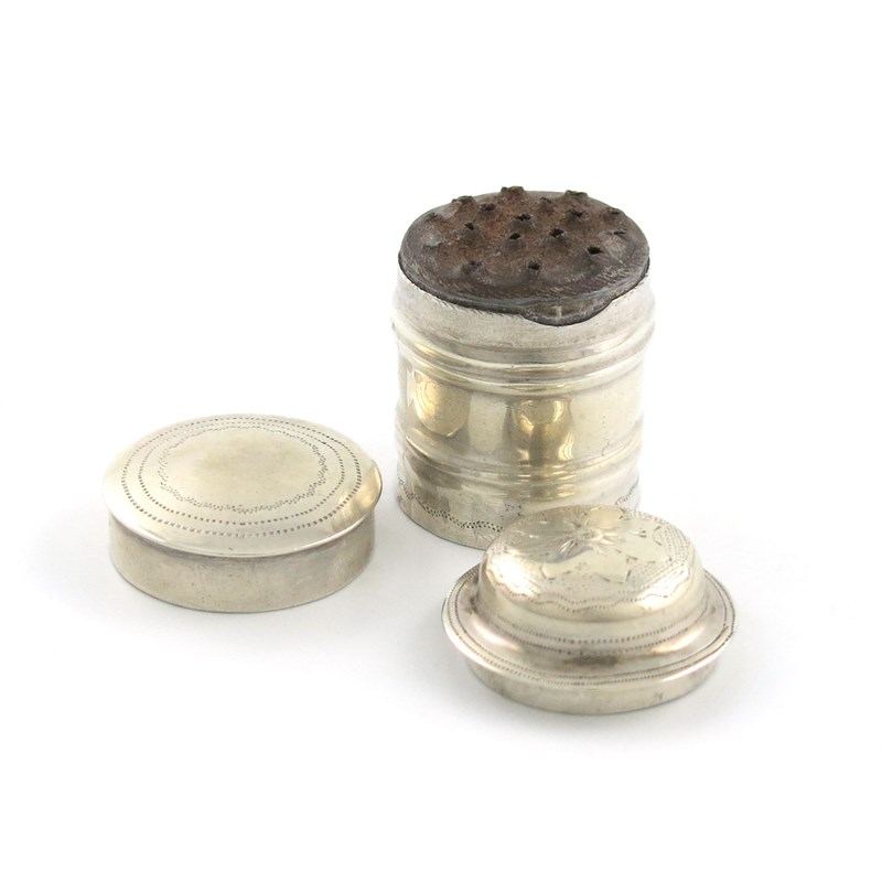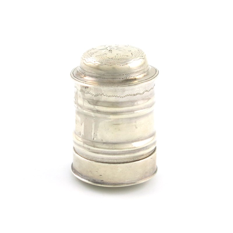 upright cylindrical form, pull-off base and domed pull-off cover, engraved decoration, with a steel grater, height 3.7cm, approx. weight 0.6oz.