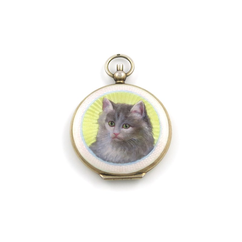 circular form, enamelled with a cat, with pink and white borders, diameter 4.5cm, approx. weight 1.2oz.