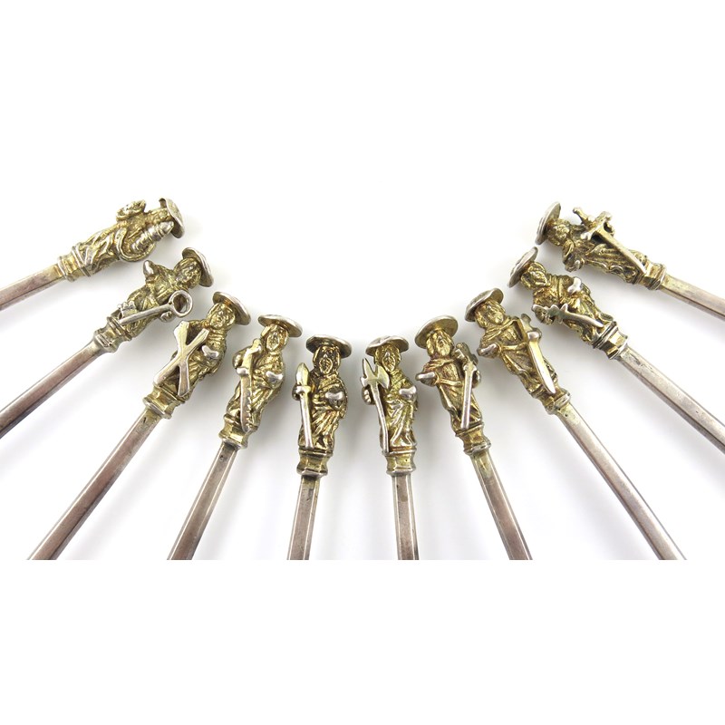 fig-shaped bowls, faceted tapering stems, gilded Apostle finials, each with a Holy Dove nimbus,