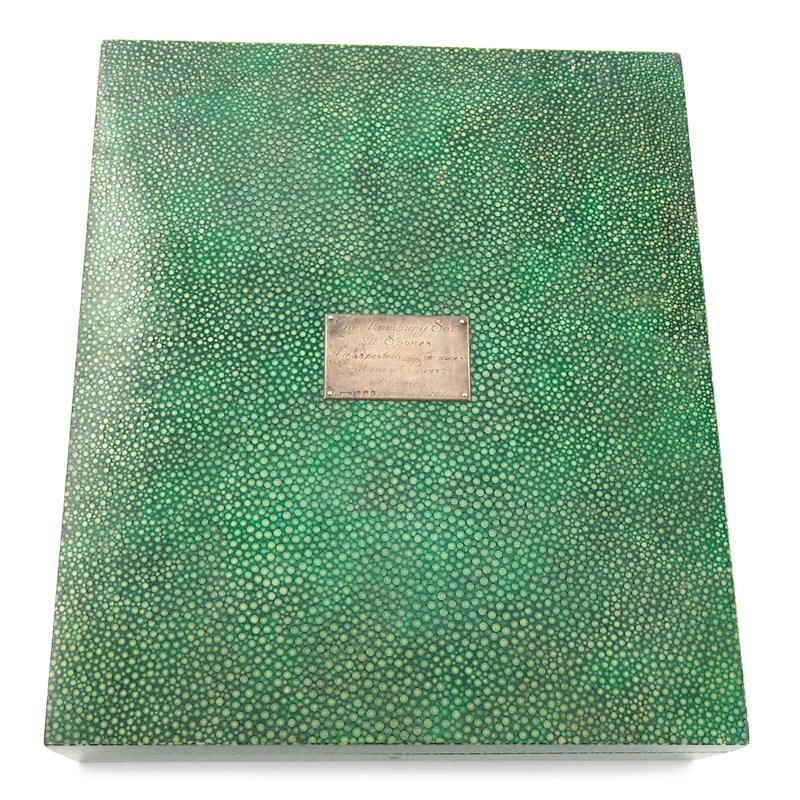in a later fitted shagreen box, fitted to fit fourteen spoons, with a silver plaque, by G Betjemann and sons, London 1930 'The Mambury Set XII spoons with appostells at the endes, and one with Christ at the ende', and later inscribed 'and one with St. Paul'.