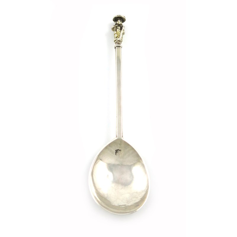 fig-shaped bowl, the reverse prick-dot engraved 'A.B over S.B', tapering stem with a gilded Apostle finial, with a Holy Dove nimbus, , length 18.2cm, weight 1.6oz.