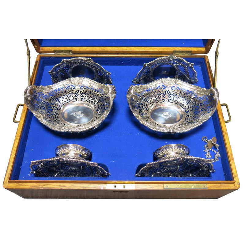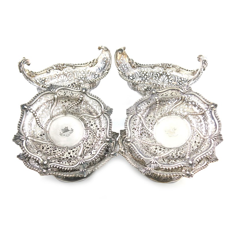 the two baskets of oval form, pierced scroll decoration, gadroon borders, on raised oval bases, engraved with a crest, the tazzae of circular form, pierced decoration, gadroon borders, on raised circular bases, in a fitted wooden case, length of baskets 25.5cm, diameter of tazzae 22cm, approx. weight 125oz. (6)