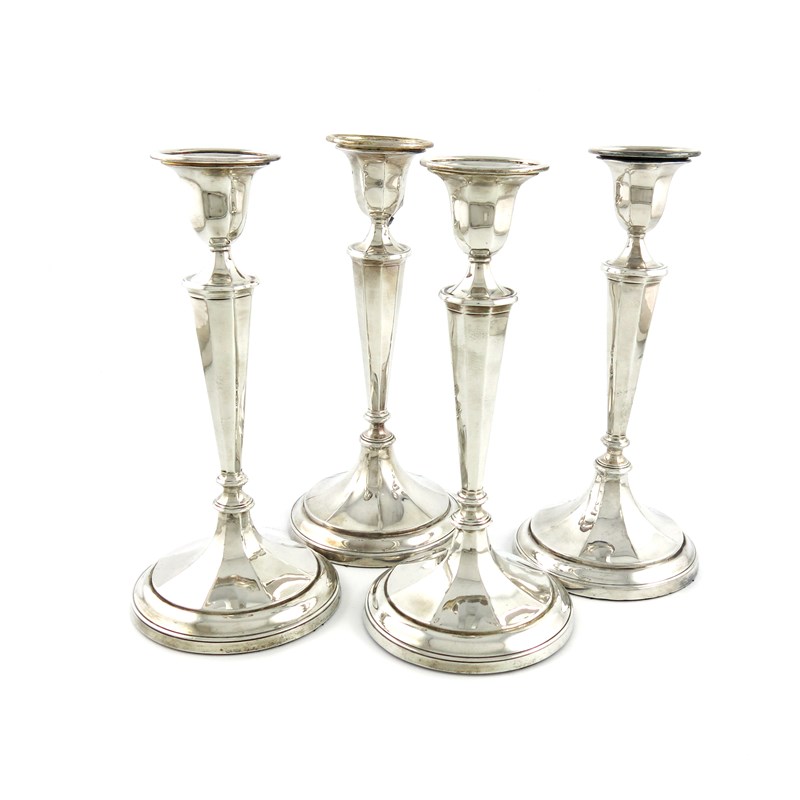 tapering panelled circular form, urn shaped capitals, on raised panelled circular bases, one drip pan a.f, height 25cm. (4)