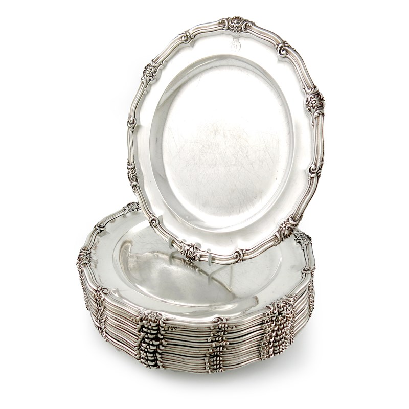 circular form, scroll and foliate motif border, engraved with the regimental badge of the 54th Regiment of Foot, the reverses numbered '25, 26, 27, 28, 30, 31, 32, 33, 35, 36, 37, 38', diameter 25.5cm, approx. weight 219.8oz. (12)