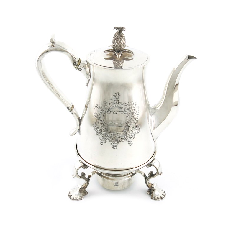 tapering circular form, scroll handle with ivory insulators, flush hinged cover with a pineapple finial, engraved with an armorial within foliate scroll mantling, the stand of circular form, on three scroll legs on shell feet, with a burner, height 23.5cm, approx. weight 34.5oz. (2)