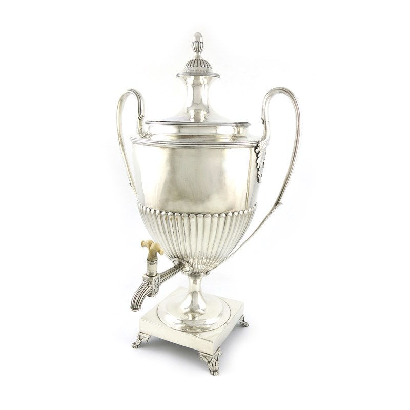 urn form, part fluted decoration, leaf capped reeded scroll handles, the pull-off cover with a fluted acorn finial, fluted spout with an ivory tap, on a raised square base on four bracket feet, height 52cm, approx. weight 102oz.