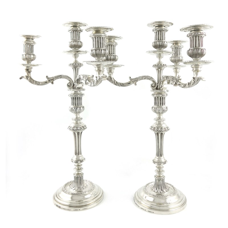 fluted knopped stems with a central fluted urn capital, with three leaf capped scroll arms each supporting an urn capital, on raised circular bases, inscribed 'R and S Garrard, Panton Street, London', engraved with a crest, height 49cm, approx. weight 183oz. (2)