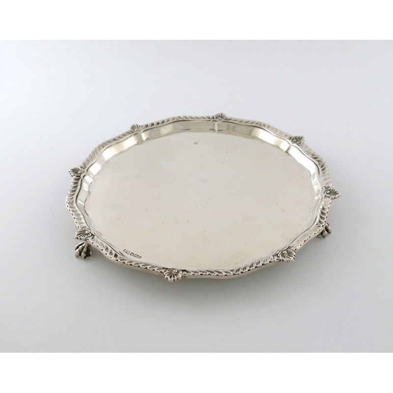circular with a shaped gadrooned border, on three paw feel, diameter 26.5cm, approx. weight 15oz.