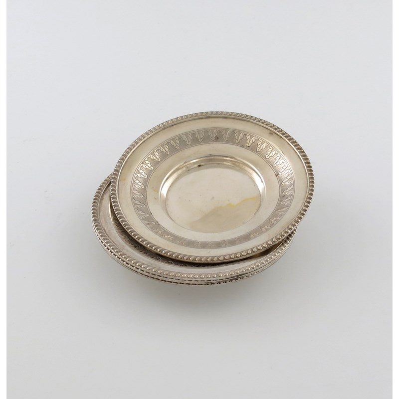 circular form, gadroon border, engraved decoration, lacking glass liners, diameter 11.2cm, approx. weight 9.4oz. (4)